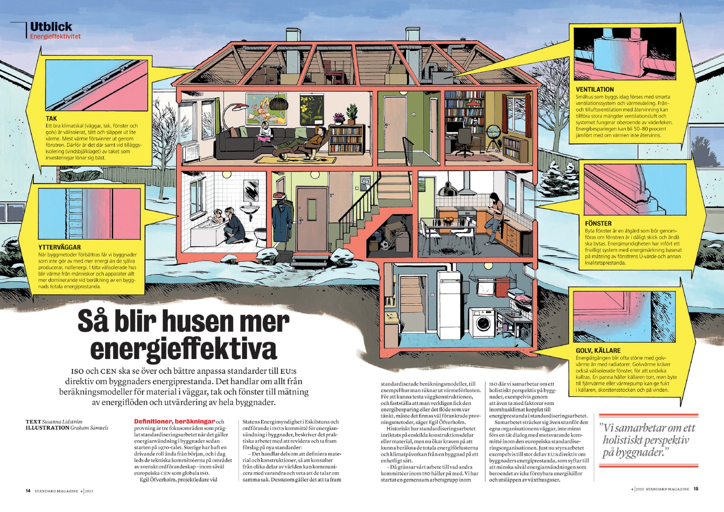 An illustrated diagram for Standard magazine, on theme of the ways in which you can save energy during the winter months by insulating your home.